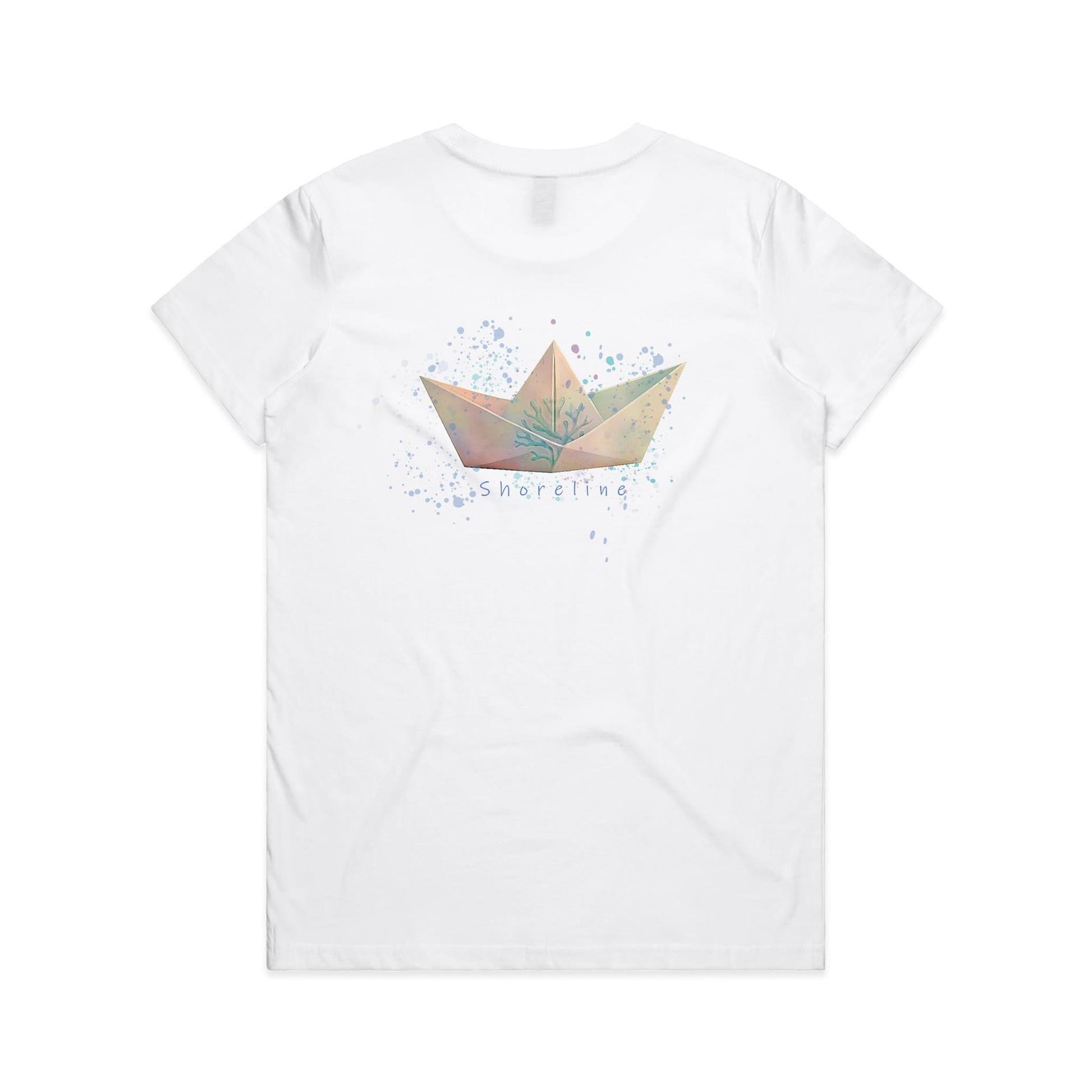 The Paper Boat design is printed on a crisp white tee. This simple, coastal-inspired illustration brings a gentle, nostalgic feel — perfect for lovers of minimal art, calm colours and relaxed shoreline style.